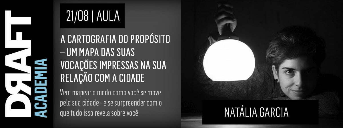 No próximo dia 21 na Academia Draft, Natália Garcia te convida a mapear o modo como você se desloca pela cidade e promete: você vai se surpreender ao descobrir o que isso revela sobre você na aula sobre Cartografia do Propósito!