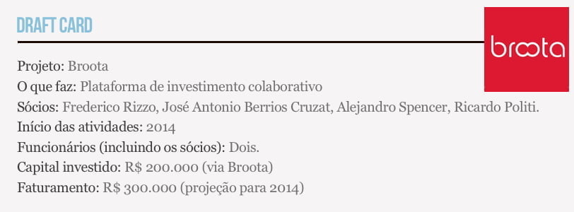 Através do Broota, os investidores podem comprar participação em empresas nascentes, mas desembolsando um valor bem menor do que o normal. Usando a sua própria plataforma, o Broota captou 200 mil reais— ou 15% do valor da empresa — para dar início às atividades, com o capital de 28 investidores. Muitos investiram menos de 10 mil reais.