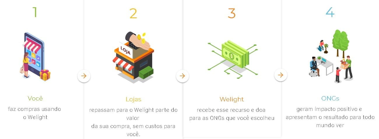 A startup opera com um conjunto de três ferramentas — site, aplicativo e plug-in — para compras online. Em miúdos: o consumidor entra no site (ou no app), pesquisa preços, faz uma compra e a loja parceira (são mais de 1 000 cadastradas, além decompanhias aéreas) repassa para a Welight entre 0,5% e 15% do valor do produto comprado. Parte dessa comissão, no entanto, é direcionada pelo comprador a um dos projetos sociais listados pelo próprio site. São 30 instituições dedicadas a várias causas, como combate à fome, questões de gênero, proteção animal, educação, meio ambiente, entre outras.