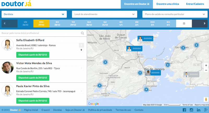 Tela de busca de médicos da Doutor Já, que tem um layout simples e pensado para ser intuitivo. A startup quer como clientes pessoas que podem pagar consultas a preços populares, em vez de usarem o SUS.