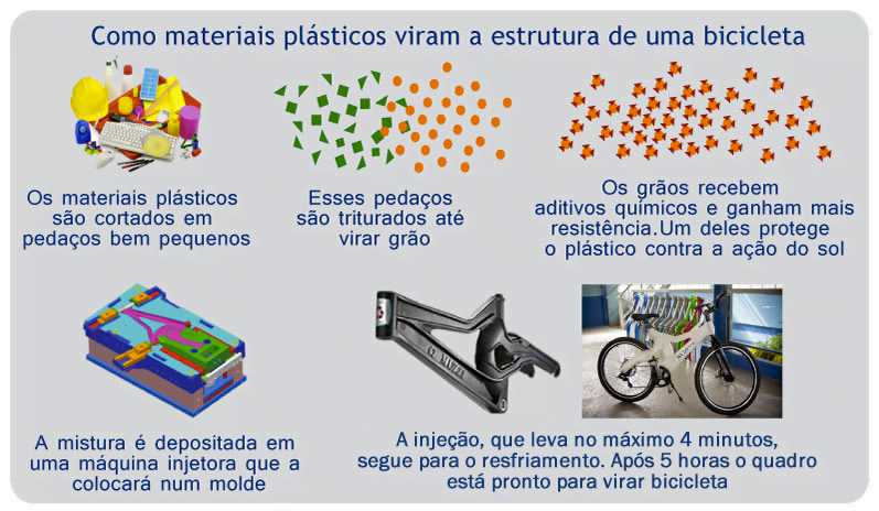 No site da Muzzicycles, um quadro explica o processo de reciclagem de plástico que resulta no quadro da bicicleta.