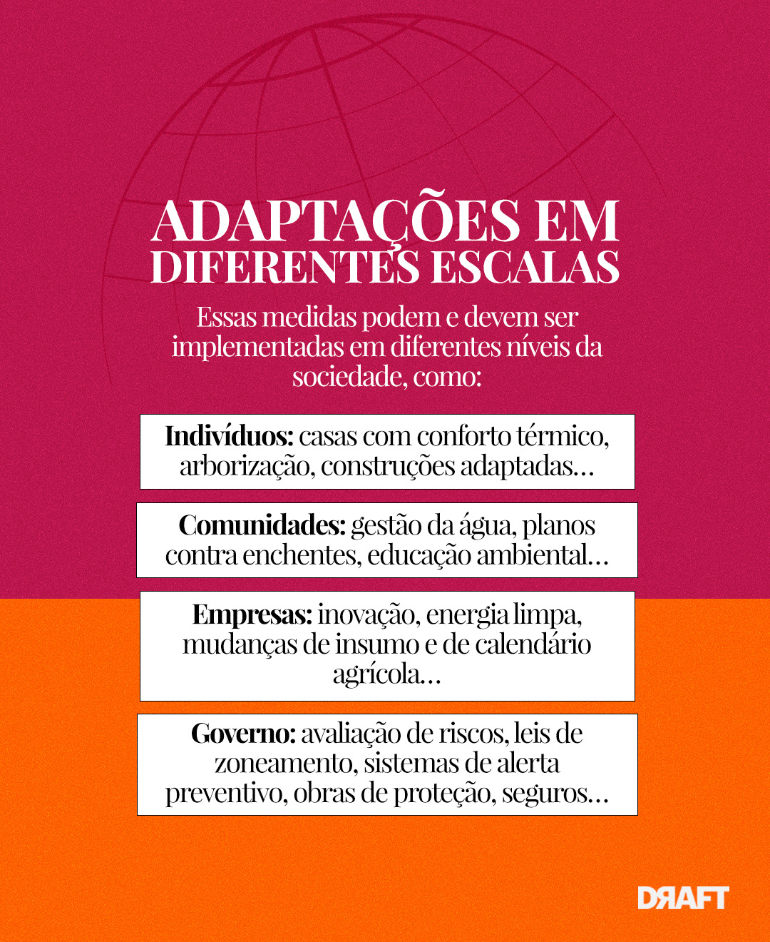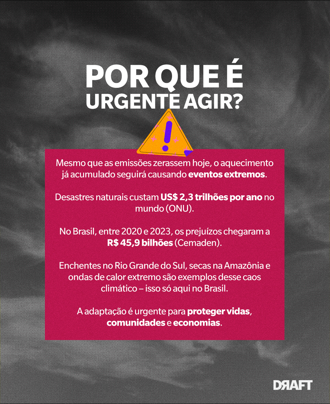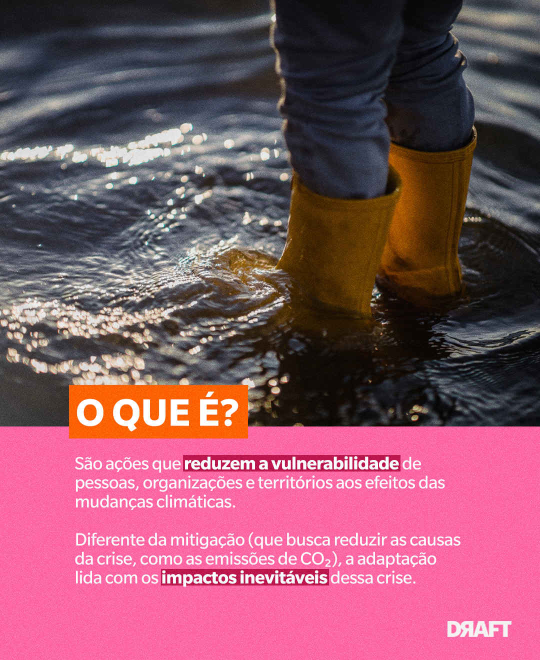 É nesse cenário que ganha força o debate sobre adaptação climática, conjunto de ações que busca reduzir a vulnerabilidade de pessoas, organizações e territórios e prepará-los para enfrentar um novo regime de clima. Mais do que uma pauta ambiental, trata-se de garantir a nossa sobrevivência no planeta.
