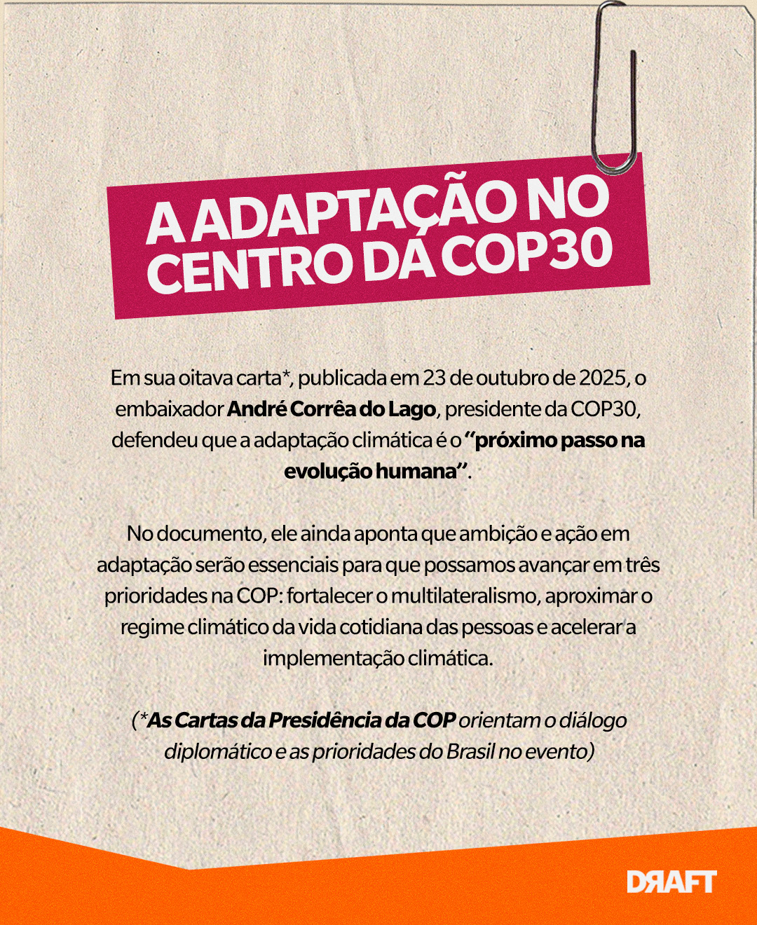 O tema deve ocupar o centro dos debates na COP30, em Belém, na próxima semana. O presidente da conferência, o embaixador André Corrêa do Lago, defende que esse é “o próximo passo da evolução humana”, como mostra sua mensagem na Oitava Carta da Presidência Brasileira.