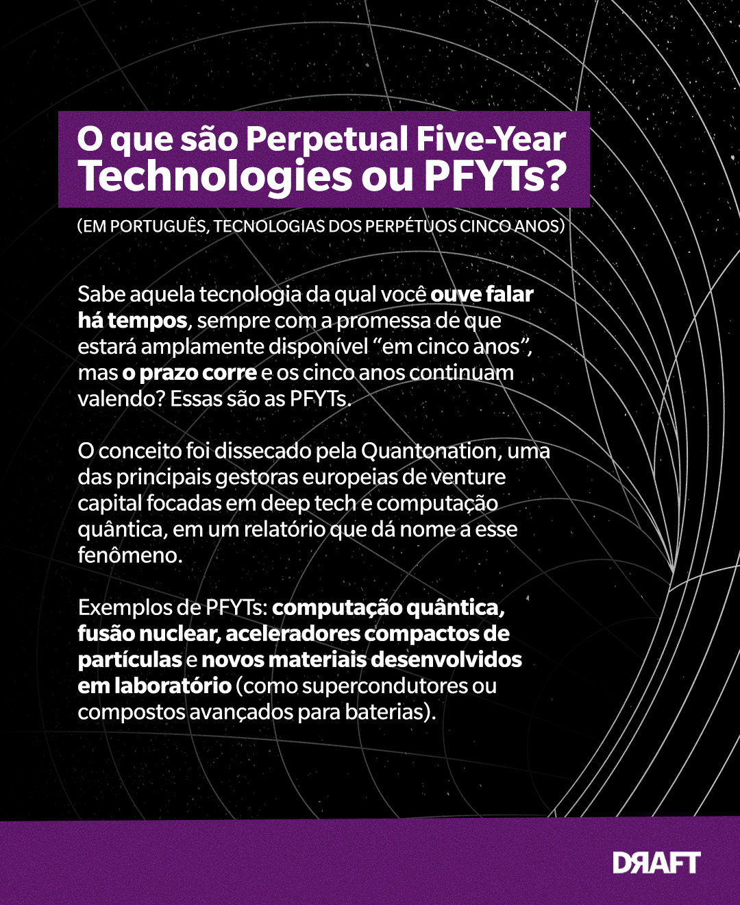 Essas são as Perpetual Five-Year Technologies (PFYTs), ou tecnologias dos perpétuos cinco anos: inovações que parecem estar sempre a cinco anos do seu lançamento. O termo foi sistematizado pela Quantonation, uma das principais gestoras europeias de venture capital focadas em deep techs e computação quântica, em um relatório de novembro de 2025.