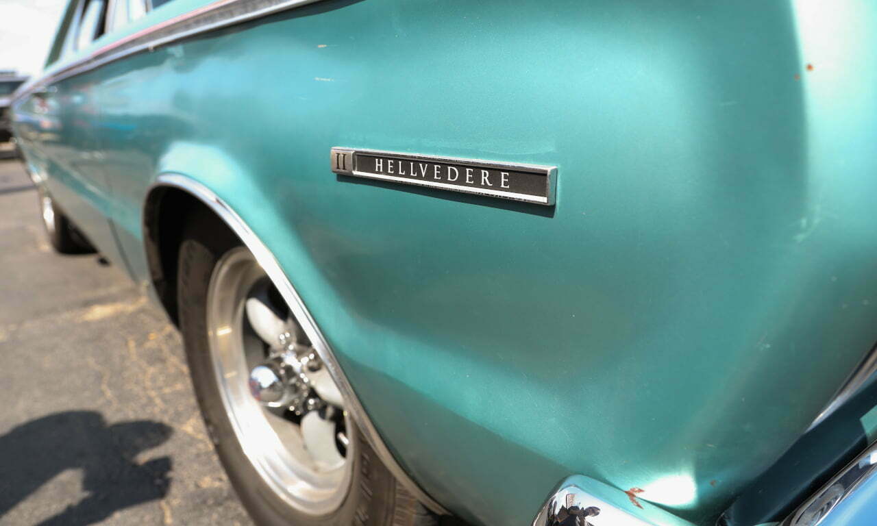 A tampa do porta-luvas é um lembrete de que antes de receber o motor HEMI V8 ‘Hellcrate’ de 6,2 litros, este Plymouth de 1967 atendia pelo nome de quase bucólico nome de Belvedere II. Já a foto seguinte (veja galeria) é o registro do novo ‘batismo’…